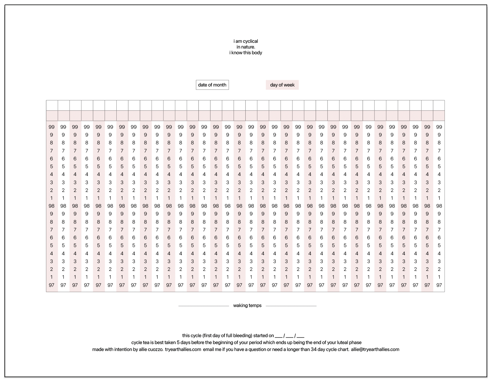 The best way to understand your cycle is to pay attention to it. This Simple Cycle tracker that is THE MOST BASIC WAY to record basal body temperatures (BBT). Since taking your waking temperature each day is a routine to get an overview of your cycle length, if & when you're ovulating, your luteal phase (the portion after you ovulate) & when you're very likely to start bleeding again (based on observing how many days your prior cycles were). With the new administration making its moves to the US White House & many people using digital tools to track temperature, this is our offering to you to provide a private & simple tangible method. It's also the easiest way to time when to give yourself cyclical support like yummy Cycle Tea, which one drinks the several days leading up to a period.